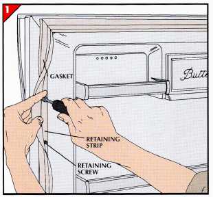 • Pull the old gasket straight up to free it from behind the retaining strip at the top of the door. • Let the o gasket hang out of the way, and slide the new gasket behind the retaining strip, beginning along the top of the door and working down the sides. Partially tighten the screws. • Working down each side, loosen the screws and strip off the old gasket; then insert the new gasket and partially tighten the screws. • At the bottom of the door, slip out the old gasket at one corner, and replace it with the new gasket before loosening the retaining screws at the other corner. Then complete the last few inches of the installation. 3. Squaring the door.
