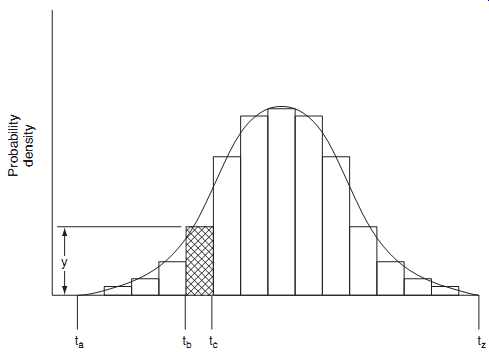 These three phase changes in the system behavior may follow each other in time ( Fig. 2). Here, ZM lim denotes a maximum allowable level of wear loss. At this level the system structure has changed in such a way that the functional input-output relationship of the system has been severely disturbed. Repeated measurements show random data variations as indicated by the dashed lines in Fig. 2. A distribution of the "life" of the system or a failure distribution can be derived from sample functions of the wear process. Earlier, we familiarized ourselves with the concept of relative frequency. The reader is referred to Fig. 2, which for convenience, is reproduced in Fig. 3. If we wish to determine the probability of failure occurring between the times tb and tc, we multiply the y-axis value by the interval _tc -tb_. Fig. 3 is also called a probability density function where the equation of the curve is denoted by f_t_. As an exam ple, if f_t_ = 0_6 exp_-0_6t_, we obtain the curve shown in Fig. 4, a negative exponential distribution which will be dealt with later. Returning to Fig. 3, the probability of a failure occurring between tb and tc is the area of the hatched portion of the distribution. This area is the integral between tb and tc of f_t_ or: tc tb f_t_dt Consequently, the probability of a failure occurring between times ta and tz is: tz ta f_t_dt = 1 We stated earlier that the failure distributions of different types of machinery systems are not the same. Even the failure distributions of identical machines may not be the same if they are subjected to different levels of Force, Reactive Environment, Temperature, and Time (FRETT). There are a number of well-known probability density functions which have been found in practice to describe the failure characteristics of machinery (see Fig. 5). The cumulative distribution function. In reliability estimations we want to determine the probability of a failure occurring before some specified time t. This probability can be calculated by using the appropriate density function as follows: Probability of failure before time = t -_ f_t_dt The integral t -_ f_t_dt is termed F_t_ and is called the cumulative distribution function. One can state that as t approaches infinity, F_t_ approaches unity.