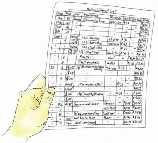 PLANNING AND SCHEDULINGIt is often said that finish carpentry-the final 10 percent of the job-takes as long as all the rest of the job put together. This is largely due to the attention to detail and the exactness that finish work requires. It also calls for accurate information and adequate instruction. Here is what you'll need to know about planning and scheduling-the first steps in finish carpentry. Stages of Construction It is important to be familiar not only with finish carpentry but also with all the steps that precede it, since they some times overlap. The stages of construction are listed in the order in which they are usually undertaken. 1. Planning. Deciding what to do and how to do it and acquiring the necessary permits 2. Rough carpentry. Laying the foundation and erecting the basic framework 3. Exterior finish carpentry. Cladding the Exterior frame work with finish materials, in stalling windows and Exterior doors, building exterior stair ways and railings, and installing exterior trim 4. Plumbing and wiring. Running lines to all points where power, water, and drain pipes will be needed 5. Heating and cooling. In stalling the systems necessary to keep the house comfortable the year around 6. Insulation. Placing batts or rigid insulation in the roof, walls, and floors; making the structure energy efficient 7. Interior finish carpentry. Putting up ceilings and walls, laying floors, building interior stairways and railings, installing cabinets and shelves, and applying Interior trim and moldings 8. Decorating. Painting, carpeting, furnishing, and adding the final touches that transform the structure into the home you envisioned Planning Successfully completed jobs begin with thoughtful planning; yours will be no exception. Planning is the most important element of a construction project. No amount of adjustment after the fact will make up for a poorly planned job. Your strategies should be based on a firm grasp of what jobs are to be done and when they must be finished. For example, it is best to complete the exterior of the dwelling be fore proceeding with the interior, to avoid the construction delays and potential damage to materials that are inevitable with inclement weather. The Exterior trim is installed before or after the siding, depending on the type of siding chosen. Interior trim, cabinets, and stairs are installed after other interior construction has been completed. The sequence of activities should be considered at the outset, in order to dovetail each job into the flow of work and achieve maximum efficiency. Once you understand how all the elements in the sequence are interrelated, you will be able to formulate an efficient plan. Scheduling Following the correct sequence in any building project is essential for several reasons. . Building codes demand that inspectors check various aspects of the job. They can make you tear out work if you have proceeded without verification. . Work that is being subcontracted must be carefully scheduled in order to be time- and cost-effective. . Poor planning could necessitate dismantling work in order to install items that were overlooked. . If all the materials that you need aren’t on hand, progress can be halted for days, or even weeks, while you wait for deliveries. (Large quantities of lumber as well as manufactured doors, windows, and cabinets should be ordered well ahead of time.) . Materials can be damaged during construction, so the most visible work should be done last. Sequence of Events Finish carpentry starts only after the basic carpentry or remodeling is complete, including everything on the following list. . Solid foundation . Girders, sills, and floor joists in place . Clean, smooth subfloor . Framework for all doors and windows . Ceiling joists in place . Framing, sheathing, and roofing installed . Stairs roughed in . Boxes for all switches and outlets nailed to studs . Outlets for ceiling fixtures nailed to joists . Gas or electric hookup for oven and cooktop . Officially approved and inspected wiring . Officially approved and inspected plumbing lines . Heating and cooling systems installed and ready for hookup . Windows and Exterior doors in place . Fully insulated roof, ceilings, floors, and walls . Effective moisture barrier .Siding installed . Floors installed . Interior doors installed Review these checklists and the information on the next four pages carefully. If any of the listed items is missing, install it before you proceed. Otherwise you risk having to tear out work so that an inspector can approve the work that is underneath. Next, draw up the materials takeoffs and correct any flaws in the structure. Takeoffs--lists of materials that can be taken off architectural drawings--let you know what supplies are needed for the job and how much they cost, so you can order them efficiently. A sample floor plan and an ac companying materials takeoff appear on pages 12 and 13. For a professional-looking job, it is important to correct any flaws that were created in the rough-framing stage before you start the finish work. Door and window openings may not be true; walls may have framing members that need to be straightened. The various corrective measures are addressed at the appropriate points in the following chapters. Doing It Yourself "I want to save money" and "Carpentry is my hobby" are the two most common reasons given by people who under take their own finish work. But there are other reasons that you may not have considered. . Many houses are built by con tractors and developers on speculation ( "on spec"). In order to sell the houses as quickly as possible, the builder aims to appeal to broad rather than specific tastes, and nothing un usual is included. . If you are a gourmet cook, a sound-conscious audiophile, or a collector of porcelain figurines, you may have particular needs that require expensive custom work. . Ensuring that a home is convenient and comfortable for a person with special need